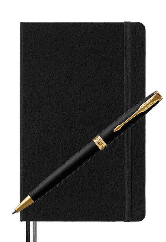 Parker Sonnet Matte Black Gt Moleskine от официального дилера Parker в Златоусте. Вы можете дополнительно заказать гравировку, которая подчеркнет Вашу оригинальность и придаст памятность статусному подарку. Все ручки Паркер поставляются в фирменном футляре.